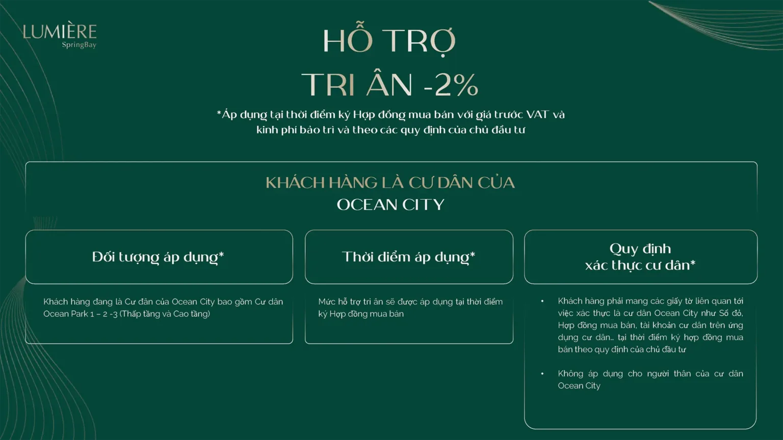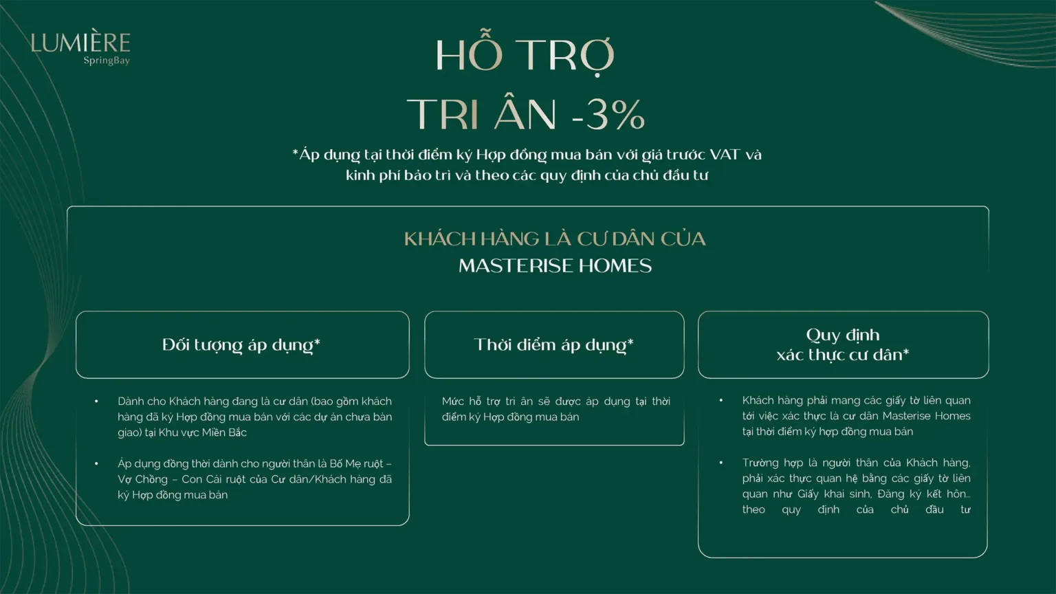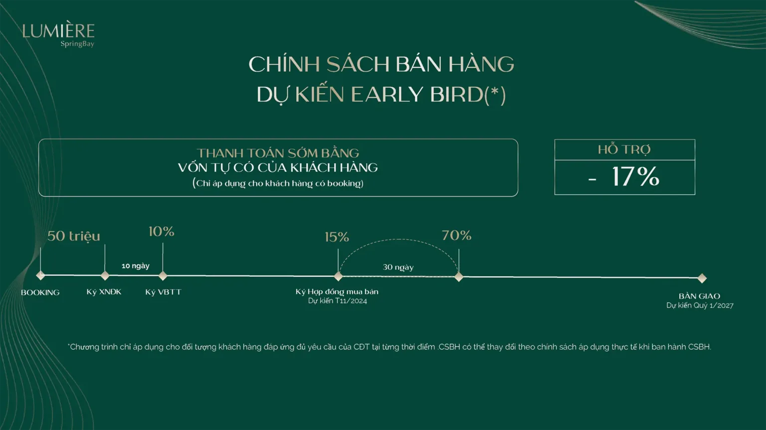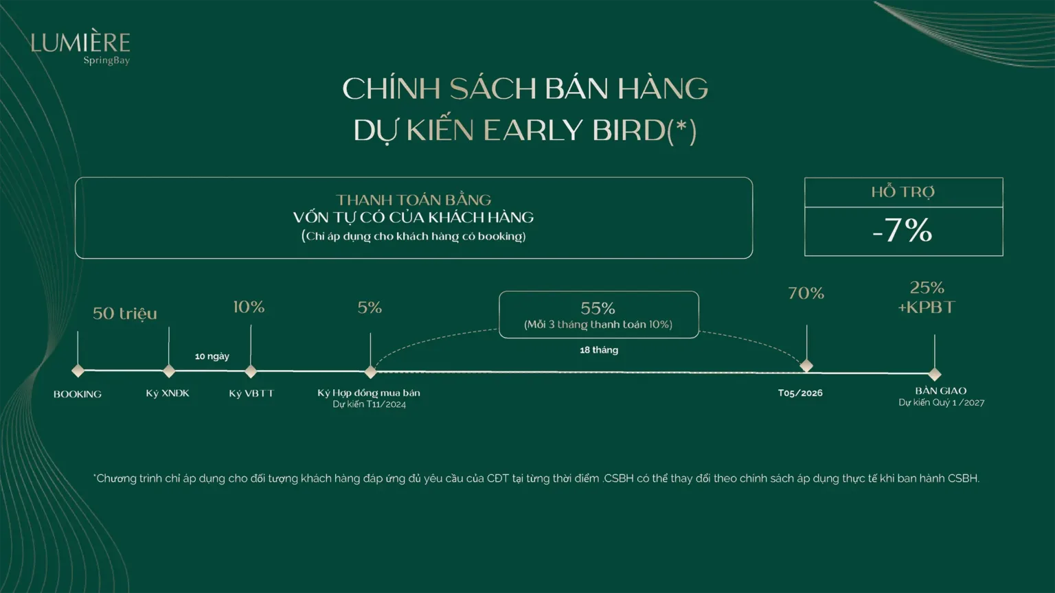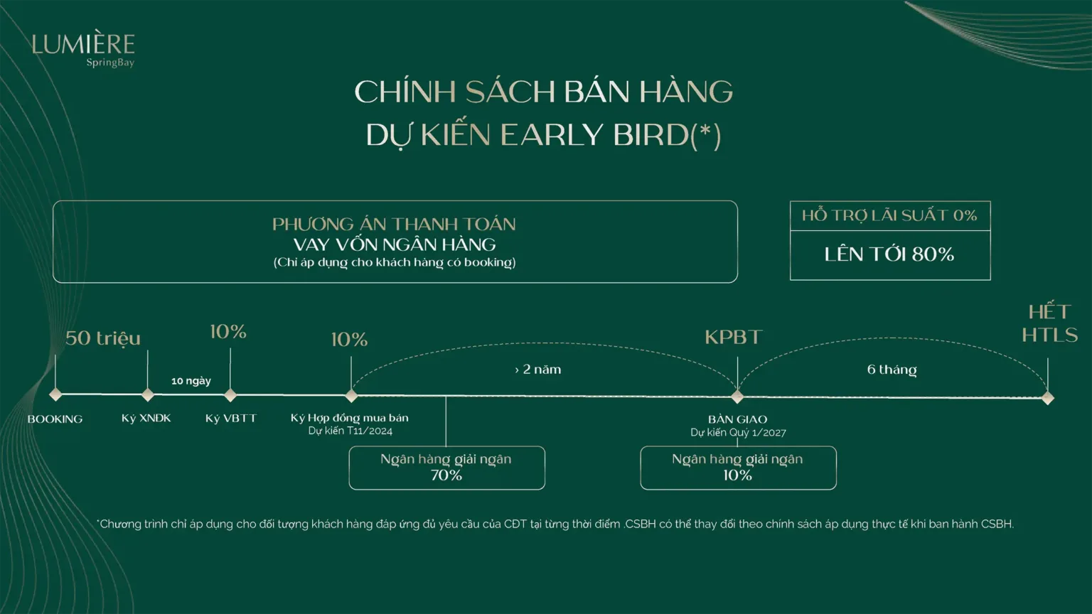 Các phương thức thanh toán linh hoạt đến những ưu đãi đặc biệt dành cho khách hàng mua sản phẩm, mỗi chính sách đều được cân nhắc kỹ lưỡng nhằm tối ưu hóa lợi ích cho khách hàng. Lumière Spring Bay nơi mà giá trị đầu tư và cơ hội sở hữu nhà ở hội tụ một cách hoàn hảo.