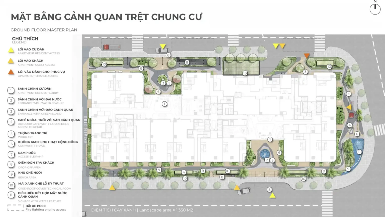 • Mật độ xây dựng của dự án là 35%, đảm bảo không gian xanh và tiện ích công cộng được bố trí hài hòa.