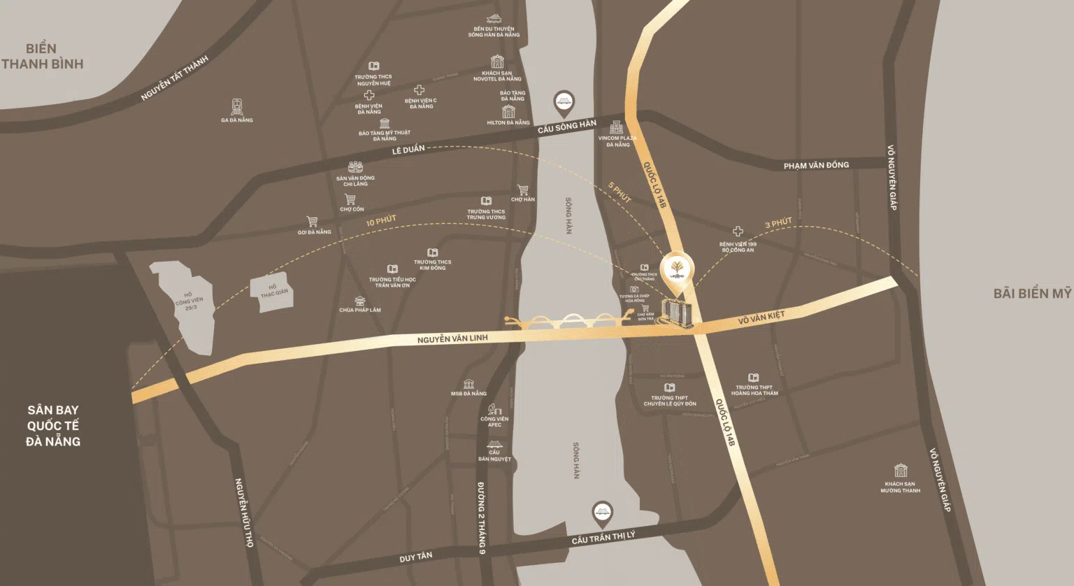 • Sân bay Quốc tế Đà Nẵng: Khoảng 3km, lý tưởng cho việc di chuyển nhanh chóng.