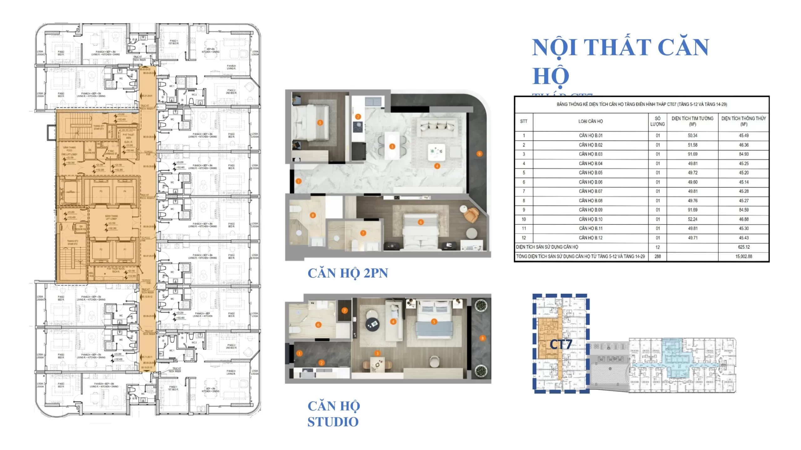 • Tầng căn hộ tòa CT7: từ tầng 5 – tầng 23 bao gồm 12 căn/sàn – 5 thang máy, diện tích: 45,4 – 54,8 (góc *2c) – 96,3 m2 (góc *2c)
